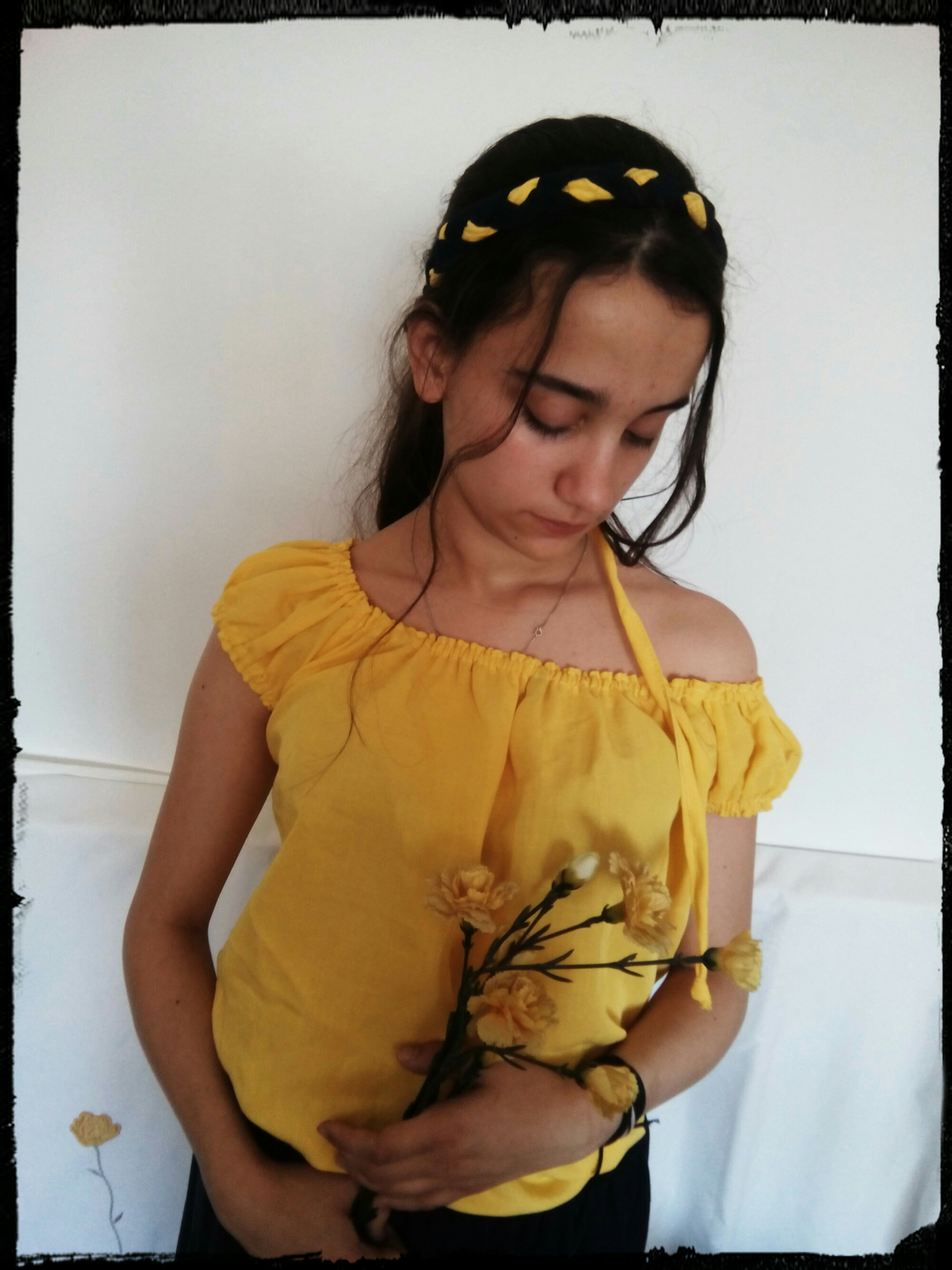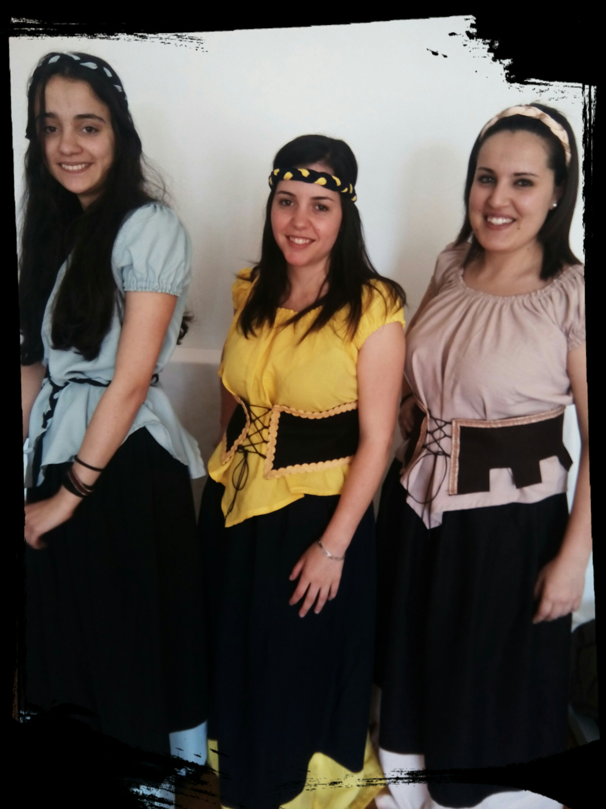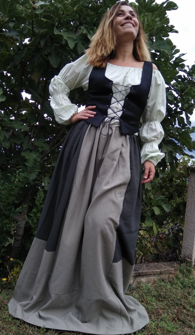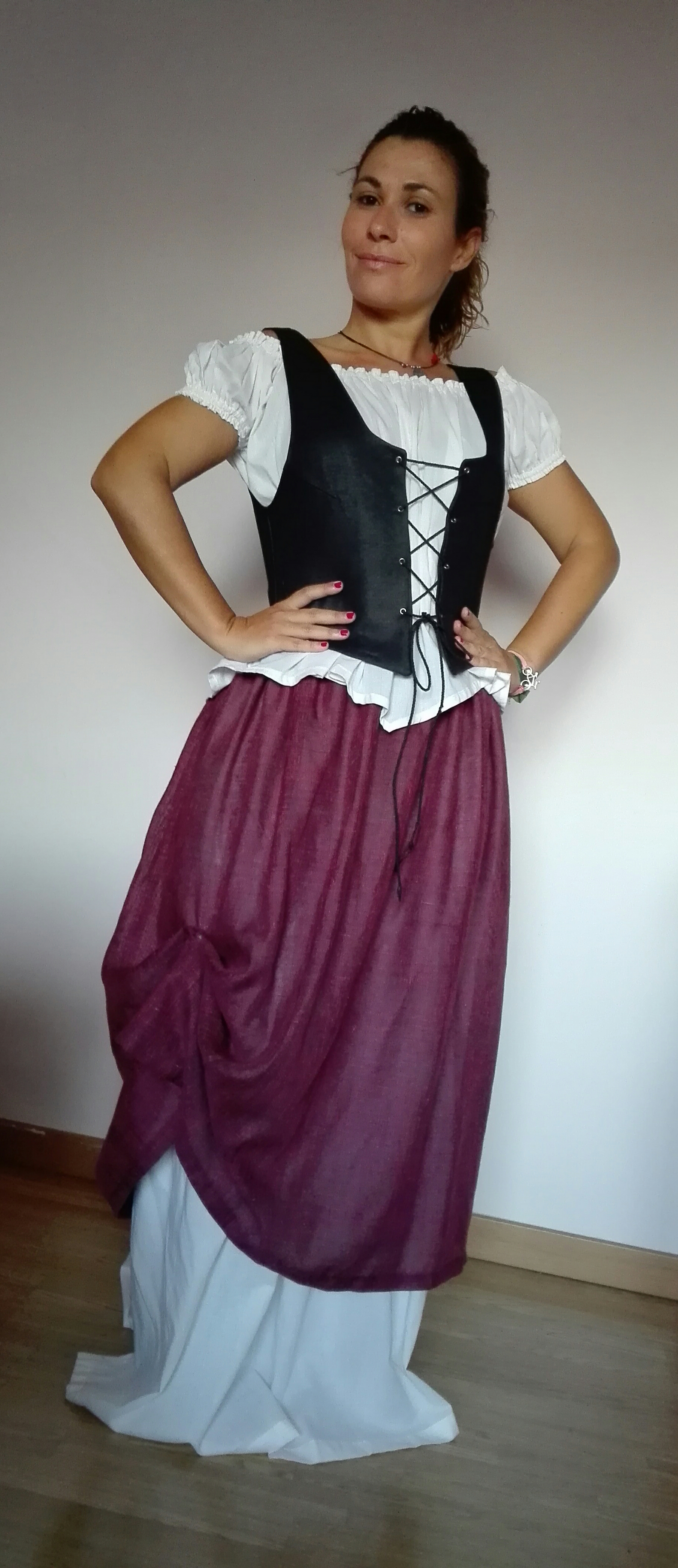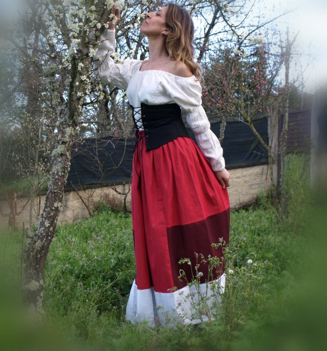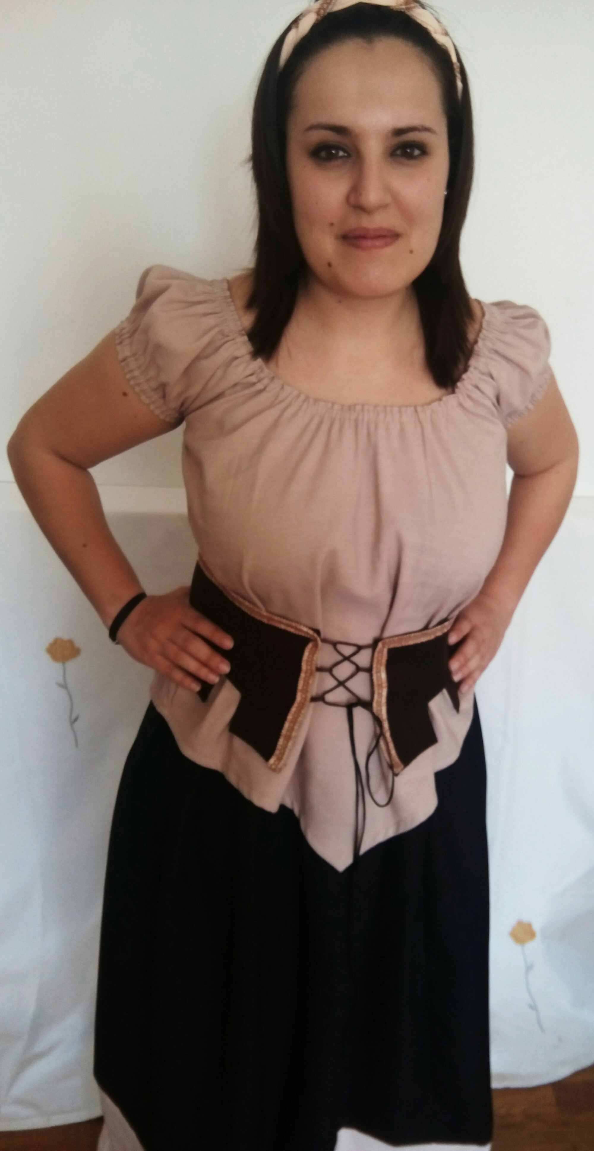 Campesina con corpiño negro, blusa blanca y falda en varios tonos