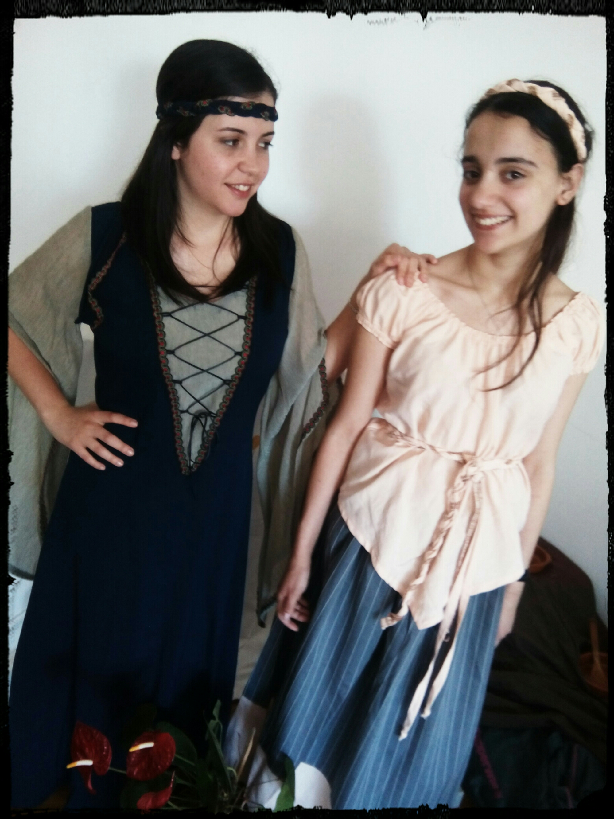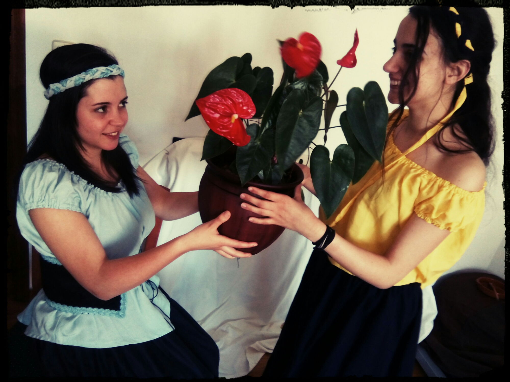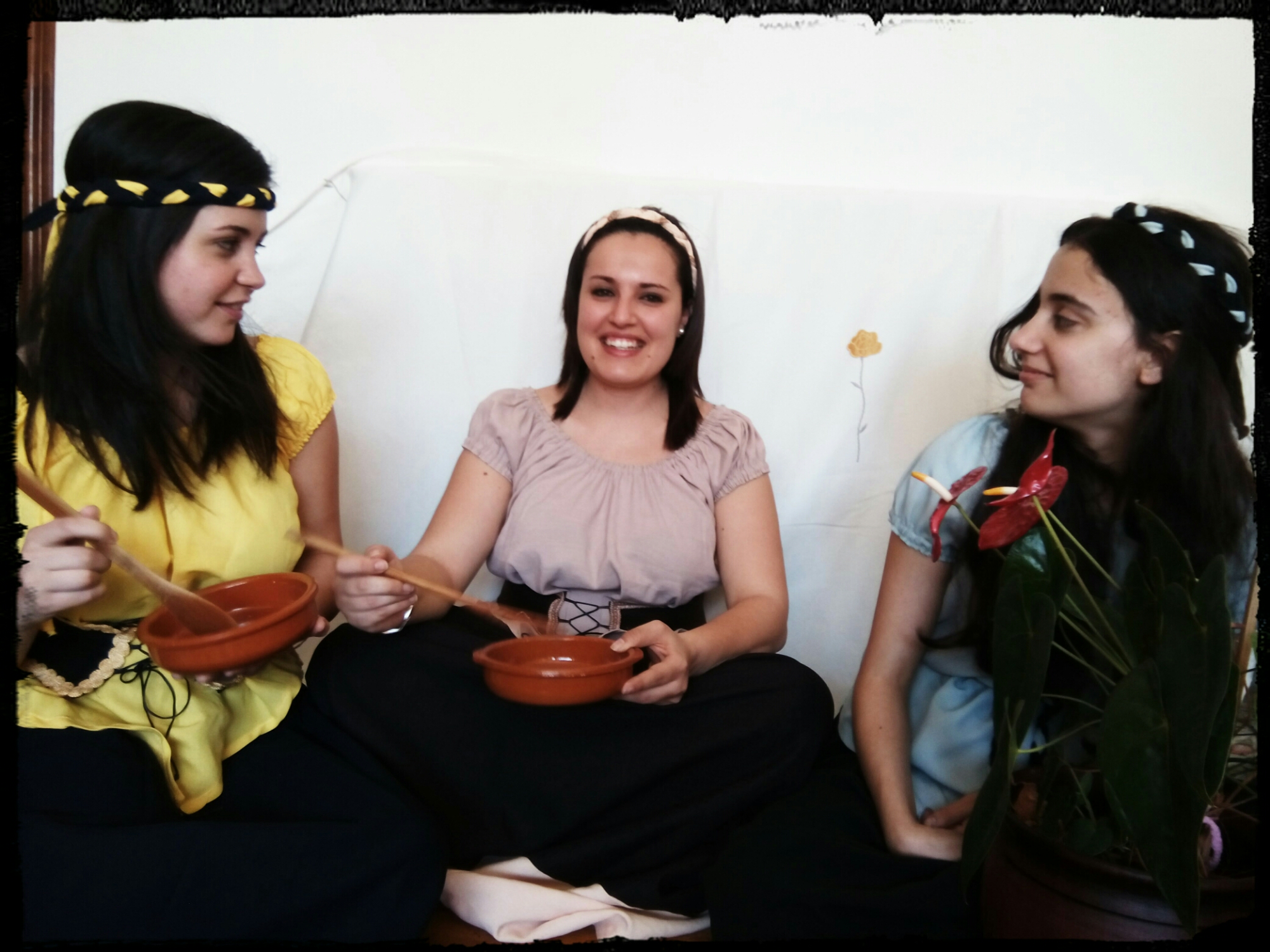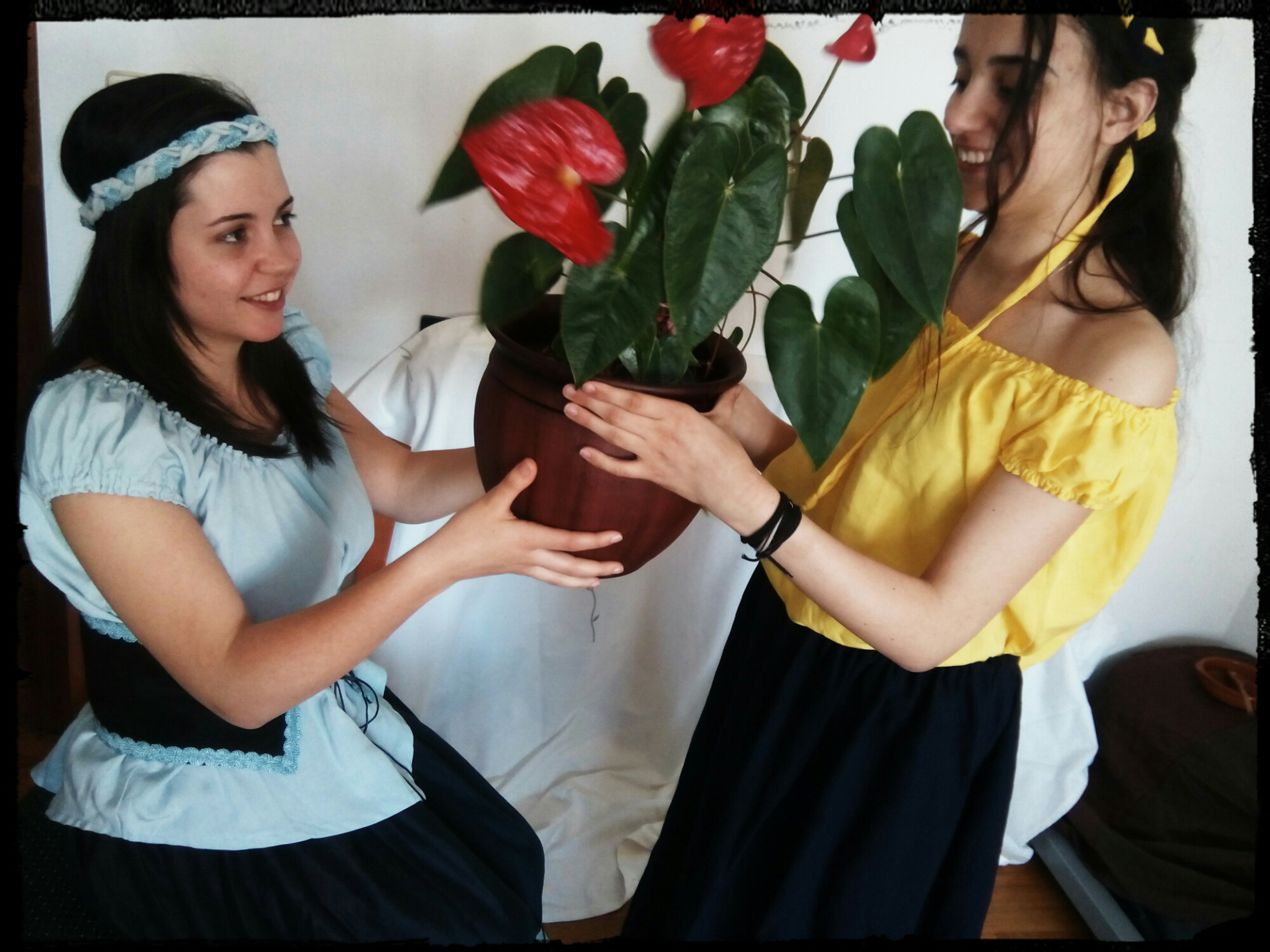 Campesina con corpiño negro, blusa blanca y falda en varios tonos