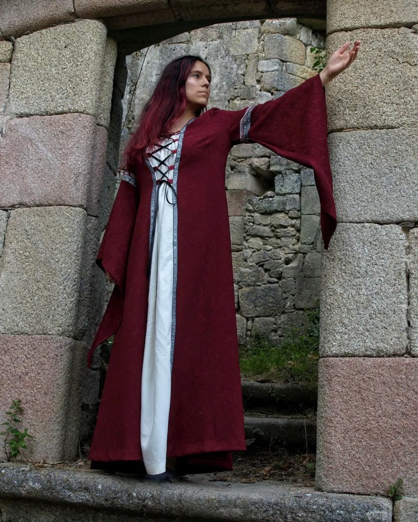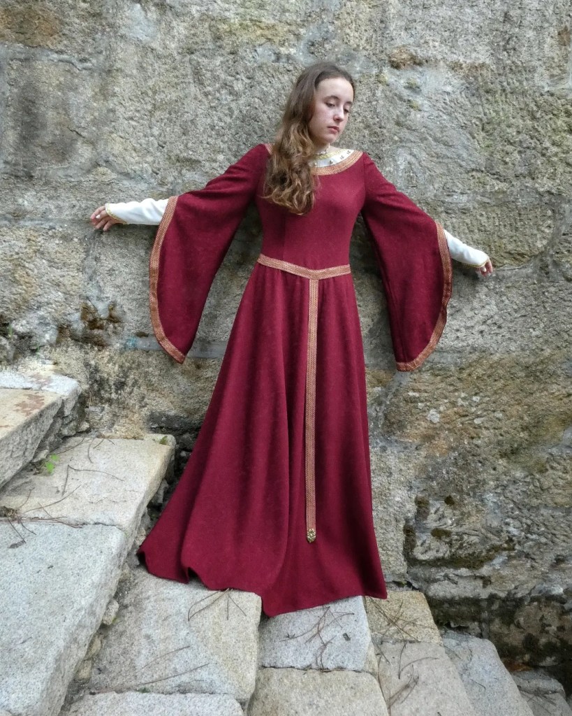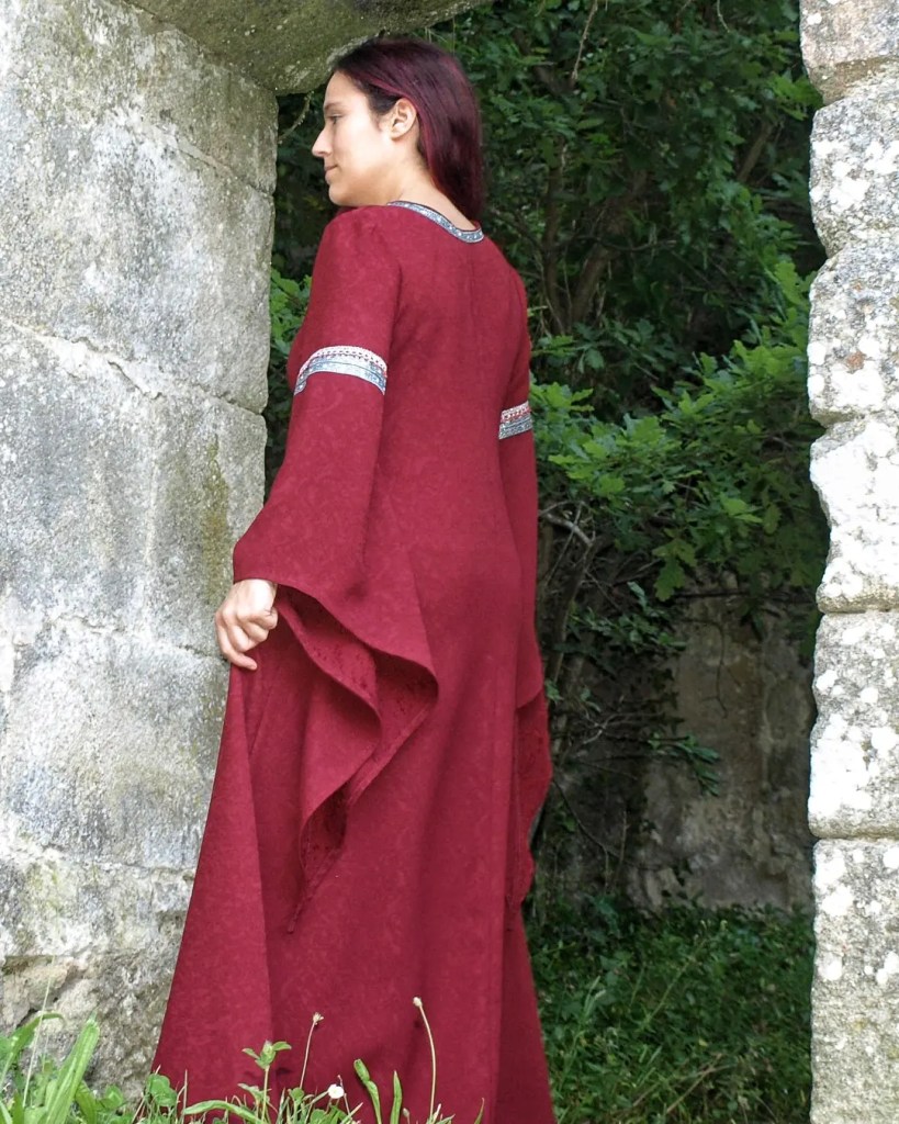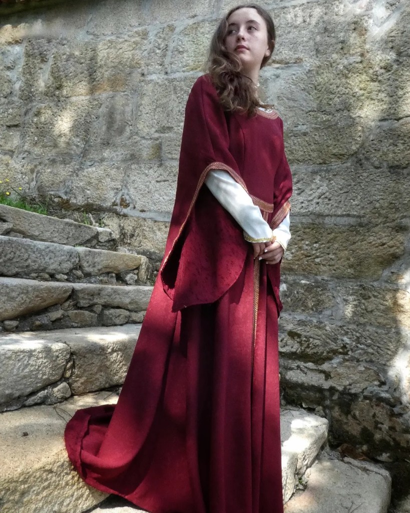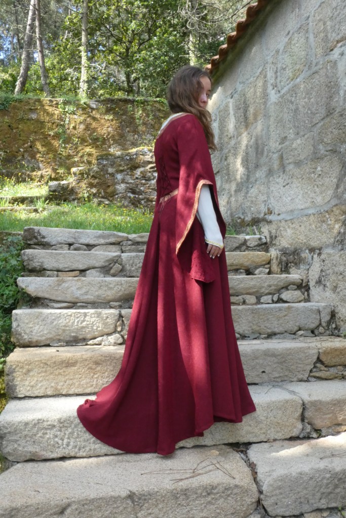 Vestido alto medieval. Lana granate y pasamanería en plateado